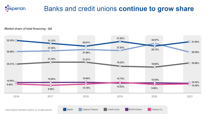 The growth stemmed from both new and used vehicle financing for banks and credit unions. Banks grew from 26.45% to 29.08% year-over-year in new financing, while credit unions reached 13.75% in Q1 2021, up from 11.24% in Q4 2020. While banks still took the top spot in funding used vehicles at 33.8% in Q4 2021, credit unions made up more of the market at 25.93%. Typically, credit unions play a stronger role in used vehicle financing, so this is in line with usual trends.