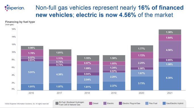 Overall, alternative fuel vehicles (including flex-fuel, diesel, gas/electric hybrids, and EVs, among others) comprised nearly 16% of new vehicle financing in Q4 2021. Gas/electric hybrids and EVs made up the lion’s share at 6.3% and 4.56%, respectively. While the percentages are small, this represents significant year-over-year growth, particularly for EVs, which doubled market share from 2.25% in Q4 2020.