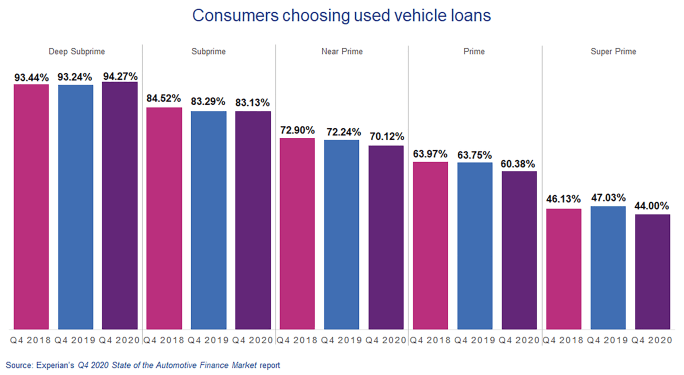 Prior to COVID-19, prime consumers began to finance used vehicles in higher volumes, which was likely driven by affordability concerns and the availability of late-model used vehicles. COVID-19 disrupted that pattern. Approximately, 44% of super prime consumers financed used vehicles in Q4 2020, down from 47.03% in Q4 2019. Similarly, 60.38% of prime consumers financed used vehicles, down from 63.75% in the same time frame.