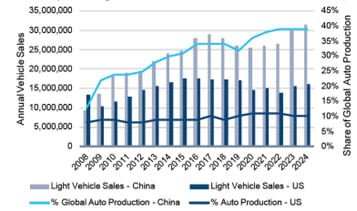 It’s the largest auto retail market in the world, surpassing the U.S. in 2009 (see chart). Now Chinese OEMs are on the verge of becoming the world’s largest automakers. Today China represents 40% of global auto production relative to the 10% U.S. share. The country leverages its superior cost efficiencies, government-backed initiatives and aggressive expansion strategies to accelerate its global market share gains.