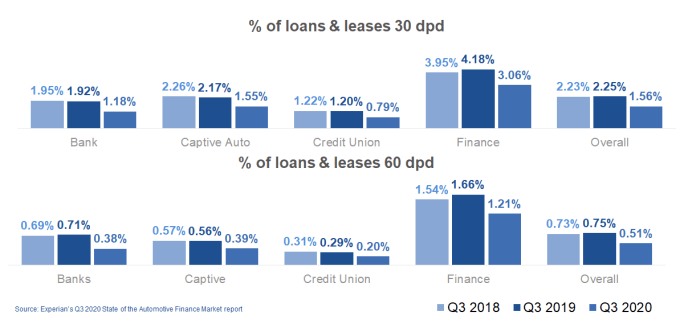 Delinquencies are often looked to as a health barometer for the automotive industry, and in Q3 2020, the data showed positive trends. Thirty-day delinquencies dropped year-over-year, from 2.25% in Q3 2019 to 1.56% in Q3 2020, while 60-day delinquencies also saw a decrease, from 0.75% in Q3 2019 to 0.51% in Q3 2020.