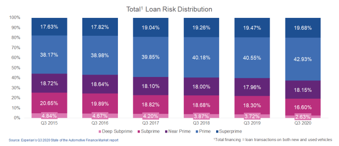 Over the last five years, we’ve seen subprime originations continually decline, and that continued in Q3 2020. Subprime loans represented 19.23% of originations in Q3 2020, compared to 22.02% in Q3 2019. Some point to COVID-19 as the singular reason for the year-over-year decline, and while it no doubt had an impact, it’s likely a combination of factors. Taking a step back and looking at the ongoing trends, the decline in subprime originations dates all the way back to 2015, when we saw subprime comprise 25.49% of loans, and decrease since then.