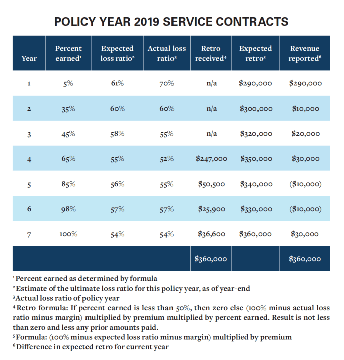 For example, suppose you have a retroactive commission for a block of service contracts. The commission is defined as 100% and loss ratio as 10%. Therefore, the insurance company is allowed a 10% margin before paying commissions. Typically, deals such as these have formulas on paying these commissions, such as the book must be 50% earned.