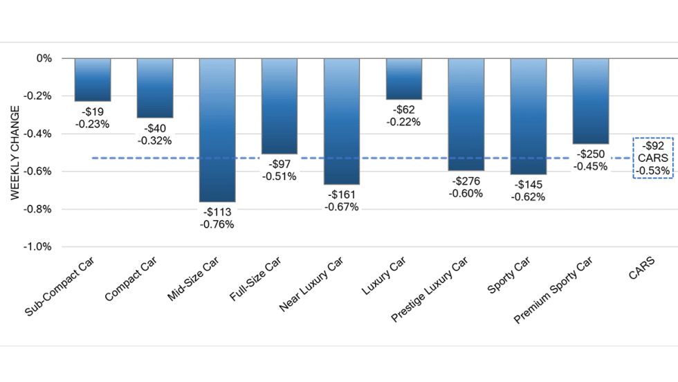 The Mid-Size Car segment had the largest decline last week, at -0.76%, compared with the prior week’s decline of -0.64%, marking the third consecutive week the segment has reported the largest segment decline.
