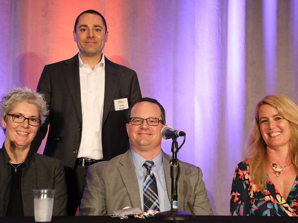 Tariq Kamal (standing) of Auto Dealer Today and F&I and Showroom helmed "Where the Rubber Meets the Road," a dealer panel staffed by (from left to right) Lori Church of John Elway Dealerships, Lee's Summit (Mo.) Honda's Jason Heard, and Sue Wilke of Rockettown Honda and Rockettown Chrysler Dodge Jeep Ram.